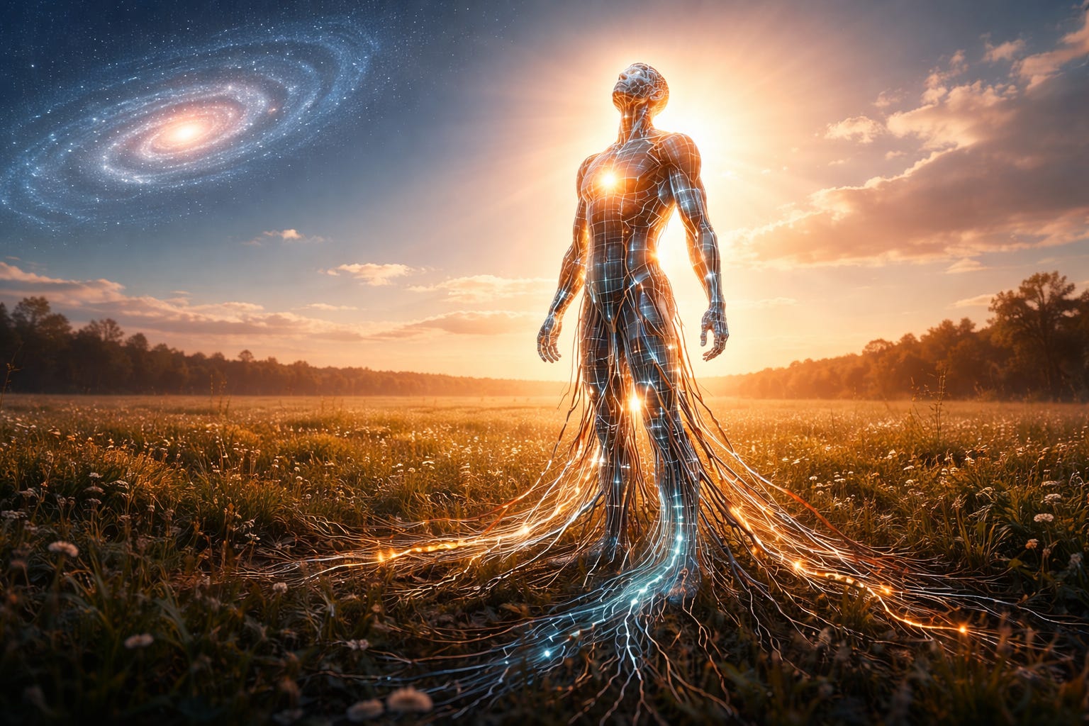 I want to be careful here. I’m not describing the end of biological humanity. I’m not proposing that flesh is a problem to be solved or that embodiment is a cage to escape. The herbalist would slap me — and she’d be right. The body is sacred. The taste of chocolate, the smell of ylang ylang, the feeling of a collie’s fur under your palm — these are not flaws in the design. They are the design.